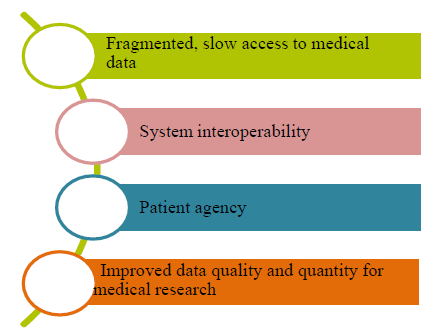With a developing pattern in medicine toward personalized medicine and patient- focused care, traditional health information technology restricts progress. With high administrative costs and a lack of universal data access, modern electronic healthcare records serve the institution rather than the patient. Blockchain innovation was at first produced for use in money-related markets, filling in as a decentralized, circulated record of exchanges. However, this innovation’s inherent characteristics make it suitable for use in the healthcare sector. Potential applications of the Blockchain in the drug industry incorporate interoperable healthcare information access, information stockpiling and security, payment mechanisms, and supply chain effectiveness. The implementation of Blockchain addresses four key issues mentioned in the below figure: