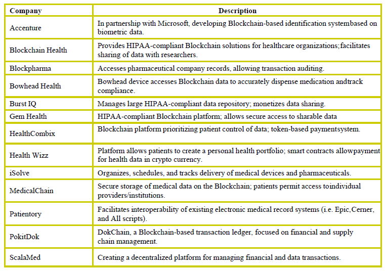 Secondly, information inside the blocks is encoded when added to the chain, to such an extent that an outside member cannot translate the inside information. Third, transactions within a blockchain are authorized using a private ID key that is only known to one person. Maintaining an identification source using Blockchain is similar to traditional identification verification. Individuals have their identities confirmed with the help of a combination of personal, financial, and government records. However, by leveraging Blockchain technology, this verification can be stored and utilized indefinitely. For patients, this can be used when attending appointments or for any pharmaceutical pick-up. For physicians, this can be used forcredentialing and licensing verification and for the transfer of licenses across state lines. The Food and Drug Administration (FDA) recently announced a collaboration with IBM Watson Health to investigate the use of blockchain innovation in oncology. The organization will help coordinate information from various sources and give a 360-degree perspective on patients. The innovation will empower all members, including patients, to share information from electronic health records frameworks. The activity is relied upon to show the transformative capability of Blockchain innovation in empowering the revelation of new tranquilizers through evidence-based research, just as it improves healthcare results for patient populations. Also, several platforms are being developed by various pharmaceutical companies to address the ideal interoperability of electronic health records. Some of them are mentioned in Table 1