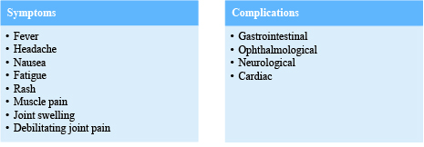 The incubation period of the disease can range from 2–12 days after being bitten by an infected mosquito. The most common symptoms and the associated complications are shown in the box below.2