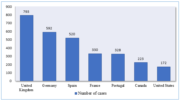 In a report by the Centers for Disease Control and Prevention (CDC), the total confirmed cases globally account for 3504 in around 44 countries. Out of these 42 countries, the United Kingdom (UK) accounts for 793 cases, leading the numbers, whereas the United States (US) accounts for 155 cases. Below is the graph depicting the countries with the highest number of cases of monkeypox throughout the globe.