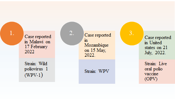 The first case reported this year was from Malawi, where a wild poliovirus 1 (WPV-1) strain infected a person. This was the first case reported in Africa in more than 5 years, while declaring Africa free from indigenous wild polio in August 2020.2