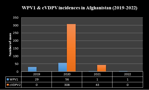 Although poliovirus eradication progress in these countries was halted or disrupted due to anti-government restrictions, the COVID-19 pandemic, and political and civil instability, polio eradication activities were resumed in 2021. Due to these strategies and approaches, the number of these cases of both strains has been reduced by 93% from 2020 to 2021; hence the decrease in incidences can be seen in 2022.9