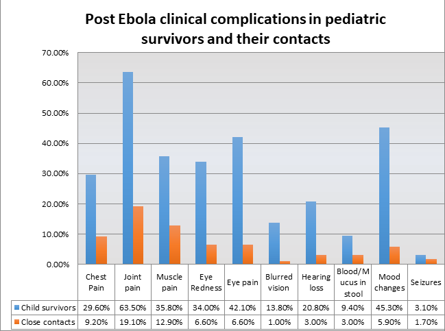 According to the results, out of total EVD child survivors, 29.6% of them showed chest pain clinical symptoms, 63.5% showed joint pain, 35.8% accounted for muscle pain, 42.1% for eye pain, 13.8% for blurred vision, 33% for hearing loss, 5% for hearing loss, and 15% accounted for blood or mucus in stool. However, in their close contact, these figures were lower.