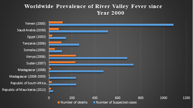 The first RVF outbreak was reported in Kenya in 1930. The virus was endemic only in Africa until 2000, when the first major RVF outbreak outside of Africa occurred in the Arabian Peninsula. The virus has now spread to other Asian and American countries as well. The prevalence of Rift Valley fever outbreaks since 2000 is shown in figure 1.5