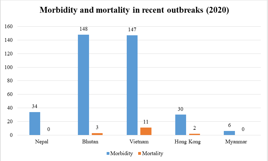 Previously, LSD was prevalent and endemic throughout Africa. However, after 2000, LSD spread throughout the Middle East and, in 2013, into Turkey and many countries in the Balkans.3 In July 2019, LSD first appeared in Bangladesh, followed by reports of cases in China and India. Figure 1 depicts the morbidity and mortality in countries recently affected by LSD in 2020.4