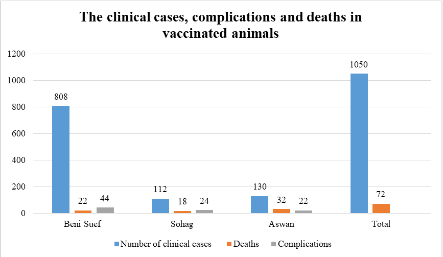 In the first case study, which took place in Egypt between 2017 and 2018, 1050 sheep pox vaccinated cattle were examined to determine vaccine efficacy. Despite having been vaccinated, these cattle exhibited classic clinical signs of LSD on clinical examination. Skin samples were taken for PCR to determine the pathophysiology of lesions. Multiple clinical complications and deaths were observed. Figure 2 shows the clinical cases, complications, and deaths in vaccinated LSDV-infected animals.5