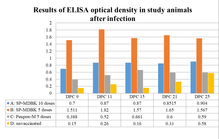 In the second study to assess the safety and efficacy of vaccines in Turkey, animals were divided into four groups to compare the efficiency of 10 doses of SP vaccine, 5 doses of SP vaccine (new SheepPox vaccine produced in MDBK cells), and Penpox-M vaccine (commercially available SP vaccine). Two cattle were left unvaccinated. All animals were infected with the virulent LSDV on day 31 after vaccination. Thereafter, blood and swab samples were collected and analyzed with the Enzyme-Linked Immunosorbent Assay (ELISA). The average ELISA optical density results of experimental animals are shown in figure 3.6