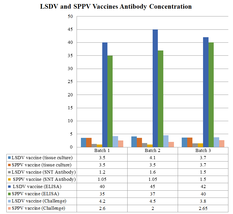 In batches 1 and 2, the LSDV vaccination titers are significantly higher than the SPPV vaccine titers for all parameters. In batch 3, the antibody titers for tissue culture and SNT antibodies were similar in both vaccines, while ELISA response and challenge titers were higher in the LSDV vaccine. These findings show that the live attenuated LSDV vaccine provided better immunity in cattle than the live attenuated SPPV vaccine. Detailed representation of the study is shown in Figure 4.7